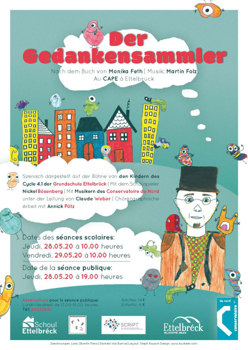 Comme tous les ans, les enfants de l'Ecole fondamentale d'Ettelbruck préparent un spectacle afin de présenter leurs talents sur la scène du CAPE. Pour cette édition, ils ont choisi d'adapter en comédie musicale l'histoire illustrée Der Gedankensammler (Le collectionneur de pensées) de Monika Feth. Cette production est comme toujours une expérience unique : pour les enfants bien sûr, qui ont la possibilité d'être créatifs, de s'exprimer et d'approfondir leurs compétences linguistiques et musicales, mais également pour les spectateurs et les familles qui peuvent à cette occasion apprécier de jeunes talents sur scène.